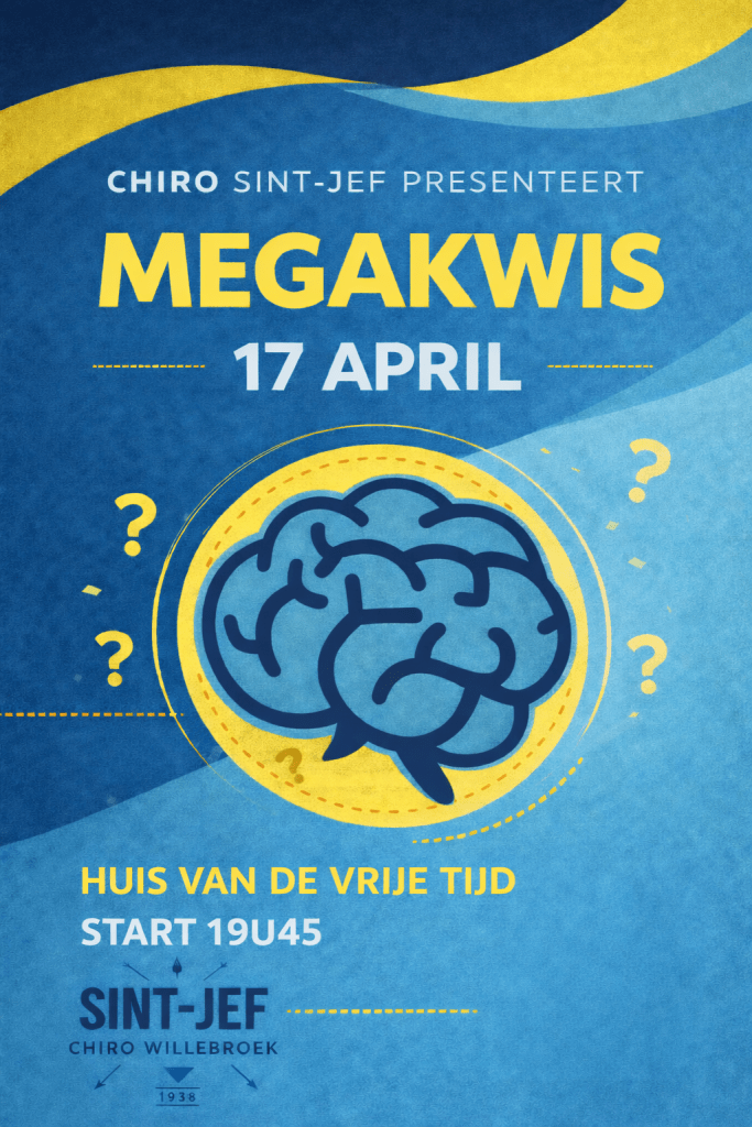 Chiro Sint-Jef presenteert ook dit jaar de Megakwis en daar hebben we MEGA veel zin in! Met trots kunnen we vertellen dat onze kwis één van de grootste kwisses uit omstreken is, met plaats voor 50 ploegen is dit de kwis waar je je kan meten met de beste ploegen. Of ben je nu niet echt zo’n kwisser bent, maar heb je wel zin in een plezante avond met je vrienden? Zoek niet verder! Drank en eten aan overvloed voor democratische prijzen! Zoals op de vorige edities voorzien we ook dit jaar een knaller van een tombola met prachtige prijzen! De hoofdprijs van de tombola wordt nog bekend gemaakt op onze socials (Facebook & Instagram).